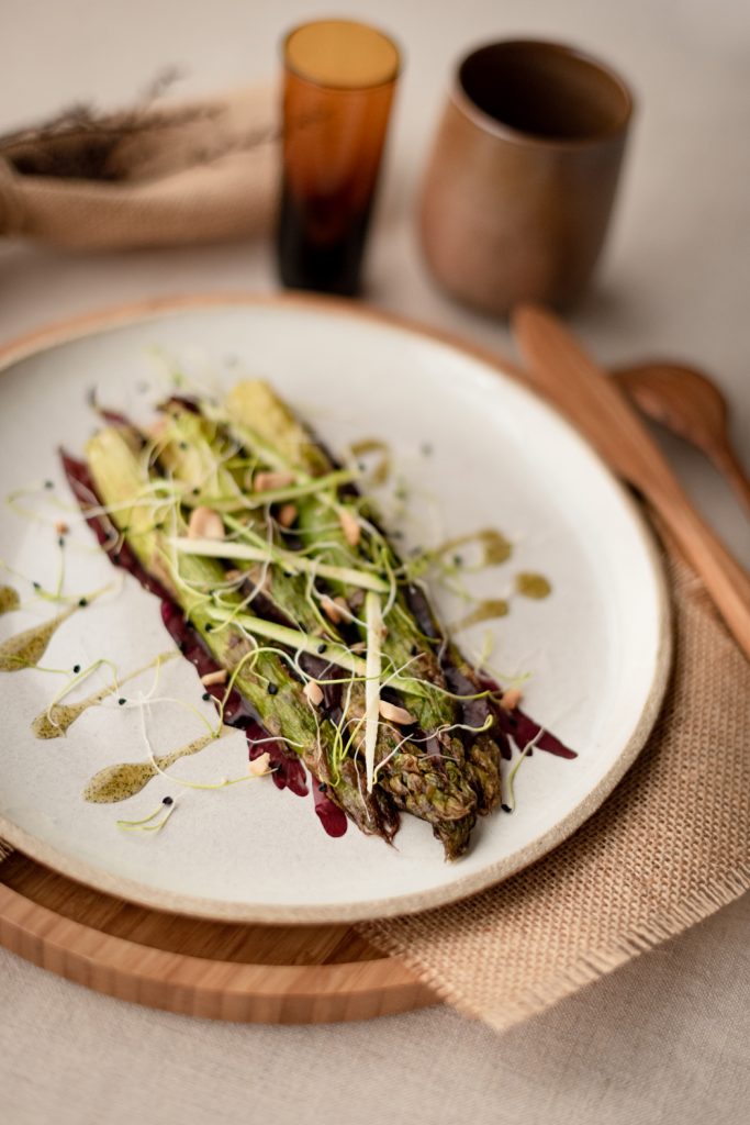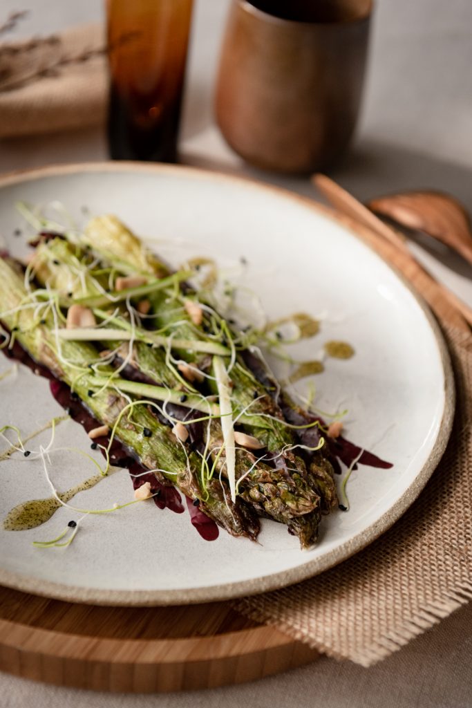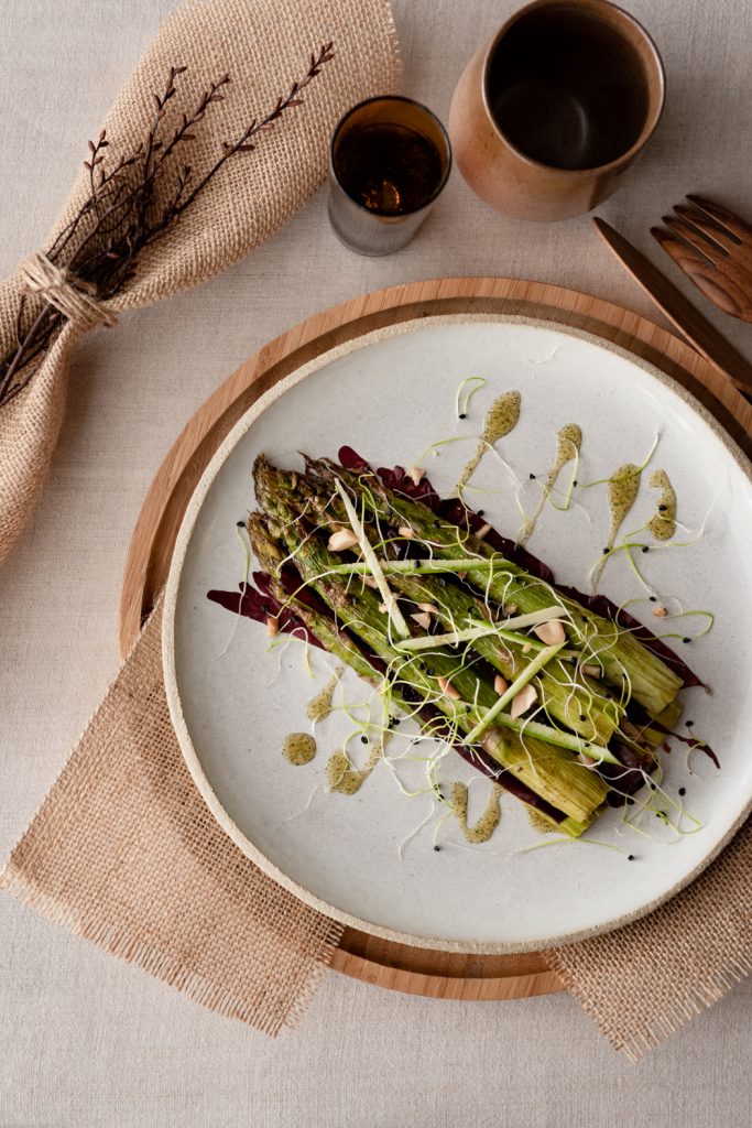 Pour cette recette, j’ai voulu mettre en équilibre la terre et la mer. L’asperge et l’algue. L’algue juste dessalée qui accompagne une asperge rôtie. Et pour le côté végétal, je vous propose une huile de basilic.