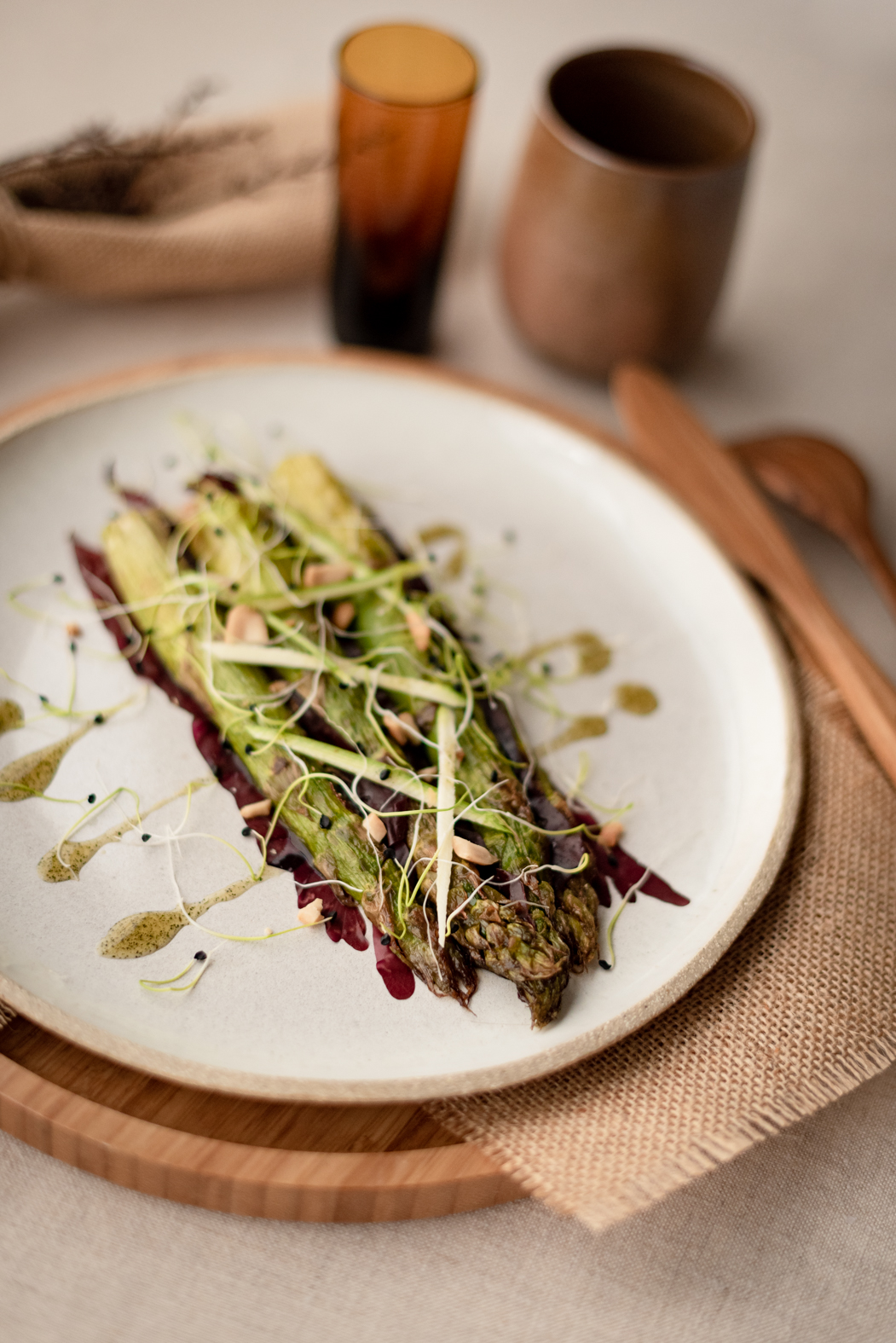 Disposer 3 asperges au centre d’une assiette. Disposer joliment une feuille d’algue autour des asperges. Disperser quelques cacahuètes concassées, des fins bâtonnets de pomme verte sur les asperges. Avec une cuillère à café, verser sur les asperges et tout autour de l’assiette. Terminer avec quelques pousses de poireaux