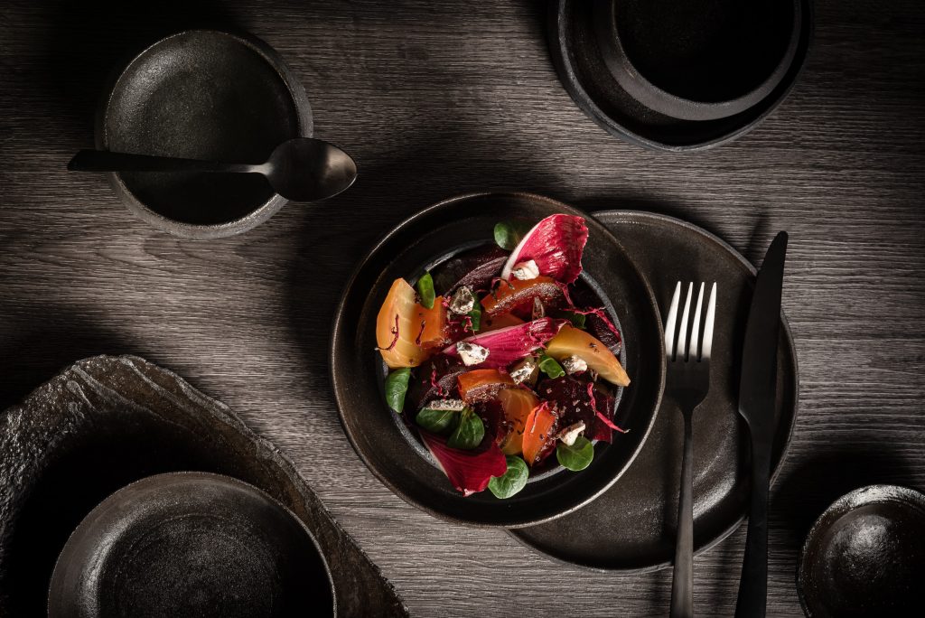 Dans une assiette creuse, disposer joliment des quartiers de betteraves rouge et jaune en alternant avec les fines tranches de pamplemousse confit et les cubes de chèvre au poivre. Terminer avec un filet d’huile d’olive et de la fleur de sel.