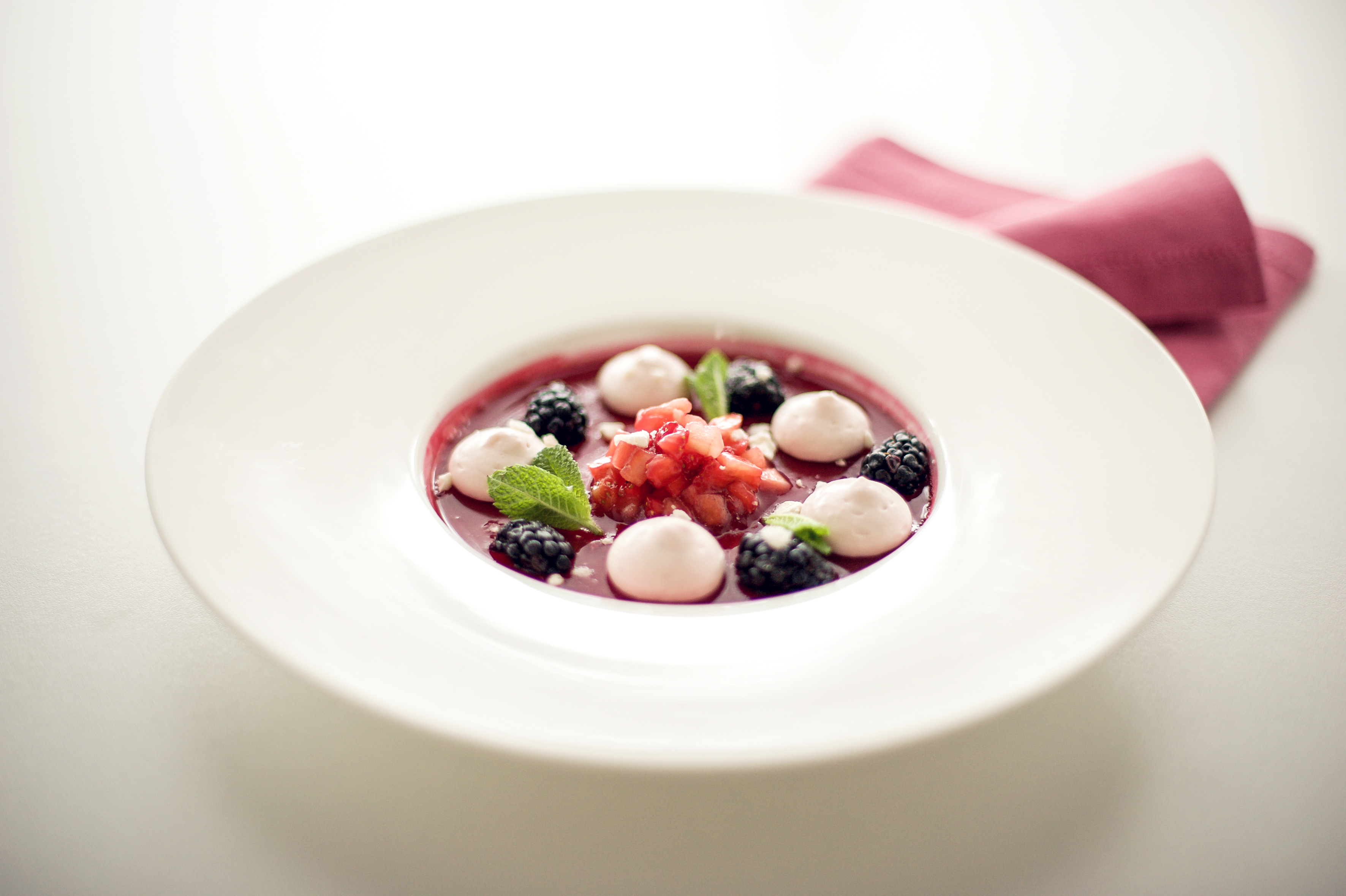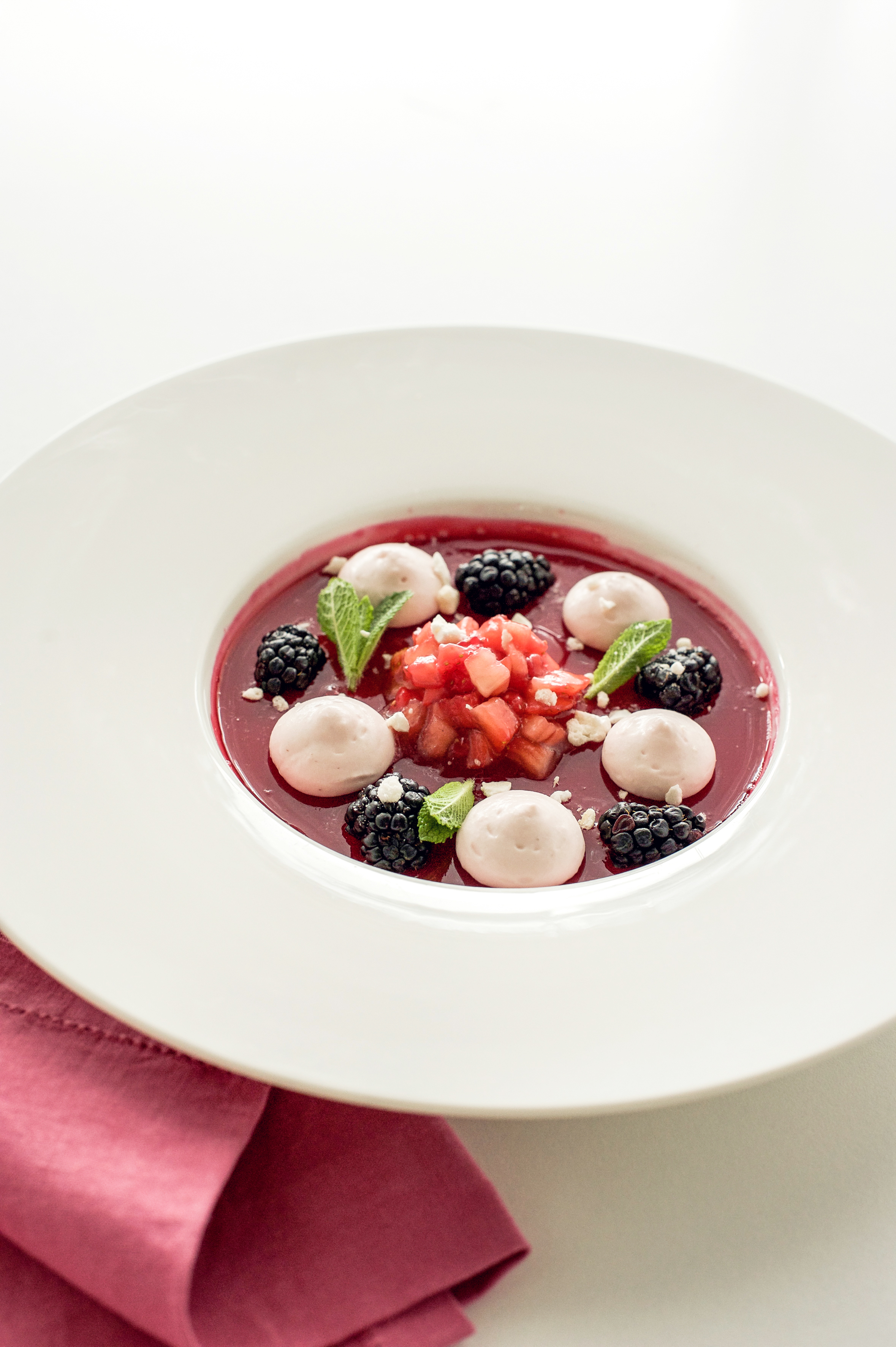 Sortir les assiettes creuses. Pocher 5 petits dômes de ganache à la fraise tout autour de la gelée. Emietter la meringue et en parsemer l’assiette. Tailler en deux les mûres et les disposer joliment dans l’assiette. Si vous avez des sommités de menthe, en parsemer dans l’assiette pour une note de vert.