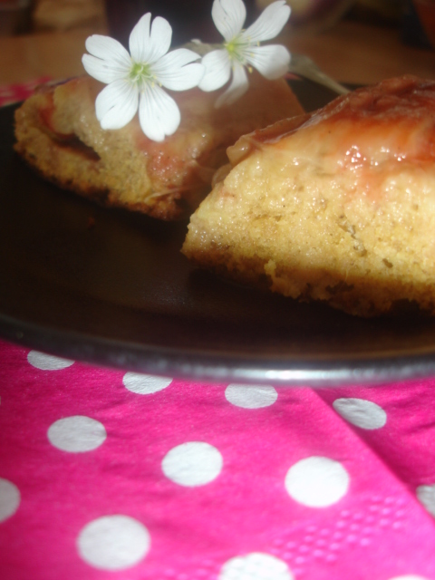 Fouetter 100 grammes de beurre doux et 120 grammes de sucre. Ajouter les grains de la gousse de vanille puis les jaunes d’oeufs un à un. Incorporer la farine (de petit épeautre pour moi) et la polenta (farine de maïs pour moi). Battre les blancs d’oeufs en neige avec une pincée de sel puis les incorporer délicatement au mélange précédent. Verser sur la rhubarbe et faire cuire 40 min environ à 180 °C.