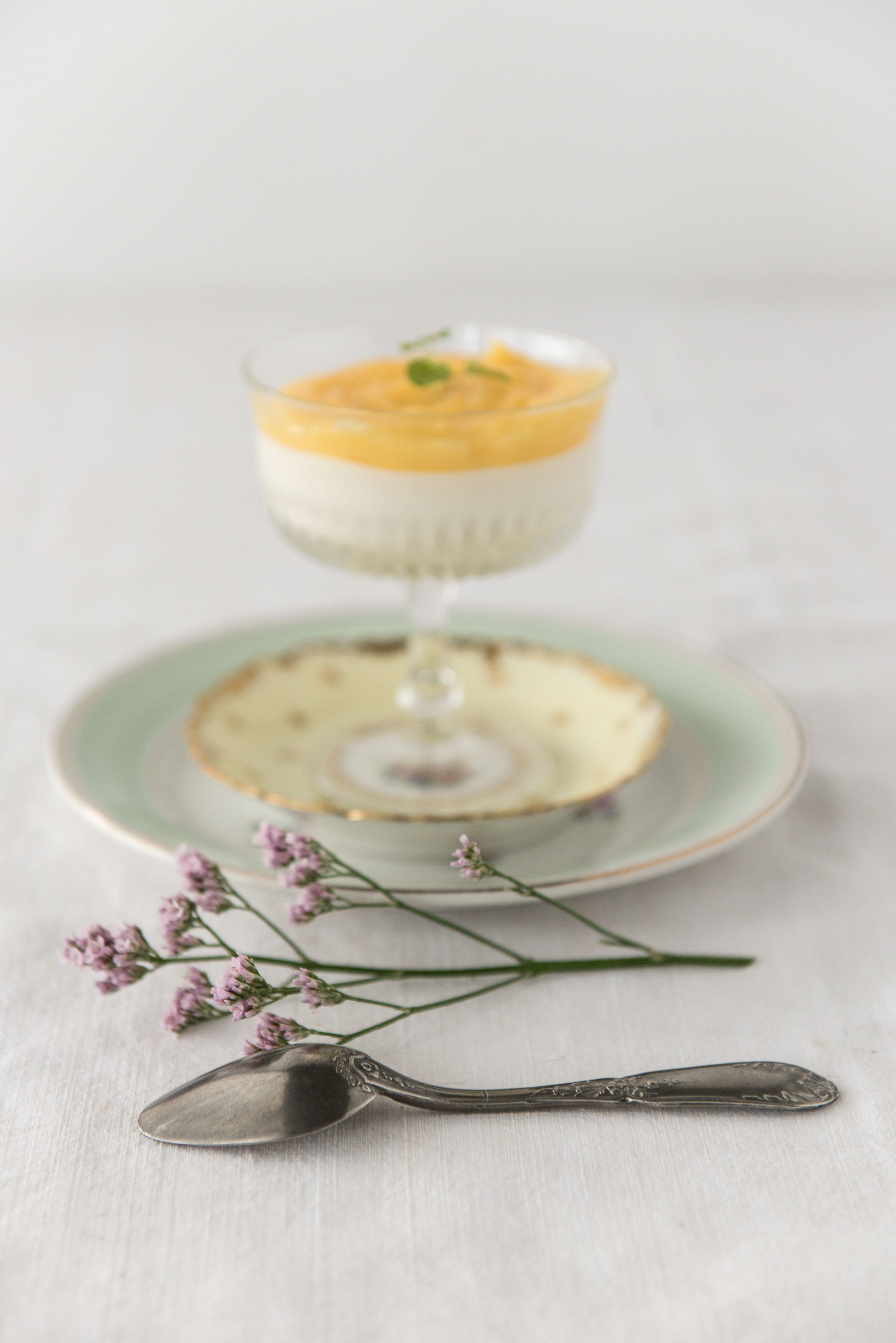 Sortir les verres de mousse d’amande du réfrigérateur. Verser 2 CS de lemon curd. Terminer par une sommité de menthe ou de basilic.
