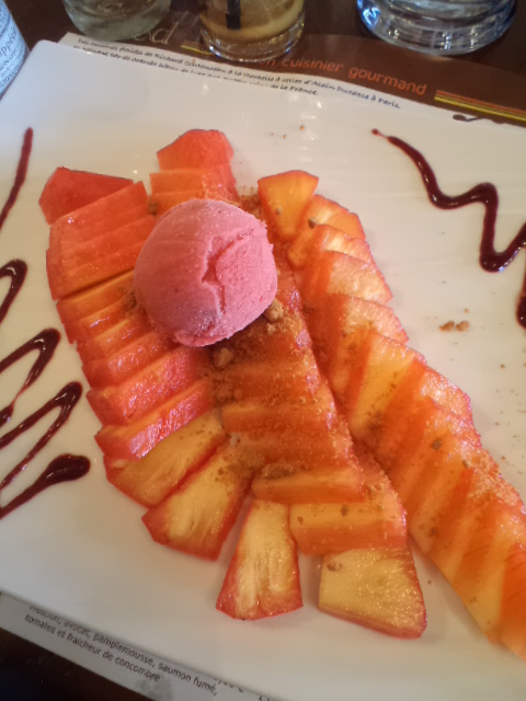 Mais avant d’y aller, fallait quand même aller se remplir le gosier avec de bonnes gourmandes. Et là, cela a été comme une évidence. J’allais amener Mr E au nouveau restaurant du Chef Frédéric Coiffé « Chez Fred », place de la Victoire. Il en va ainsi des certitudes où l’on sait que nous ne serons pas déçus et ce fut le cas.