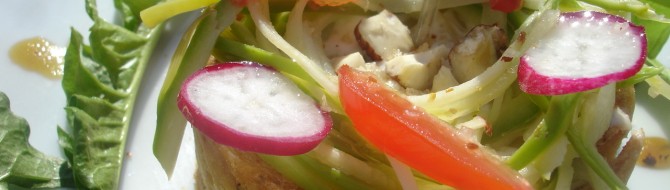 Laver les asperges. Couper la base. A l’aide d’une mandoline ou d’un bon couteau, émincer les asperges en fines lamelles. Avec un bon couteau, émincer ces lamelles d’asperges vertes en julienne.