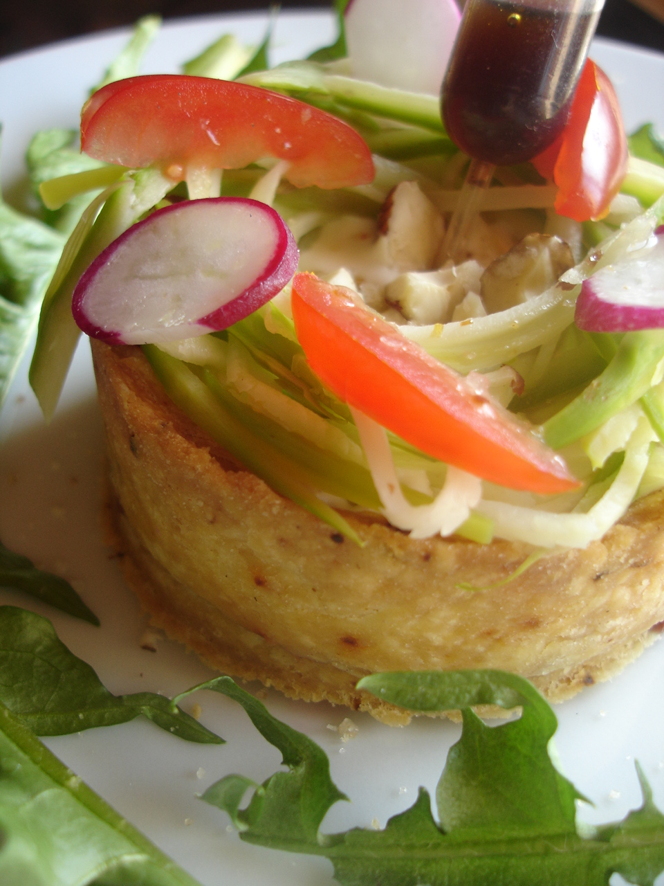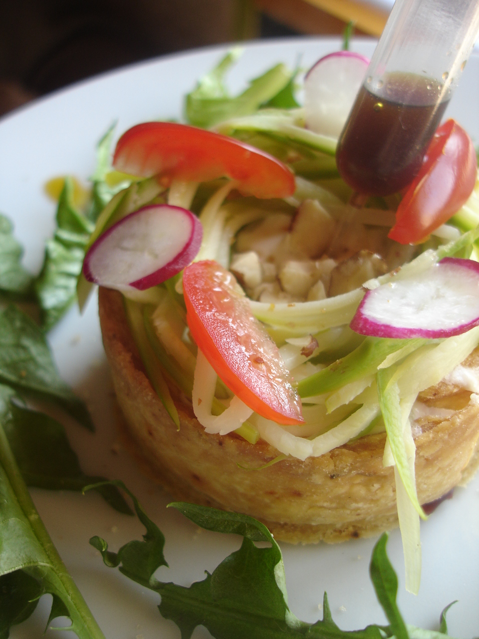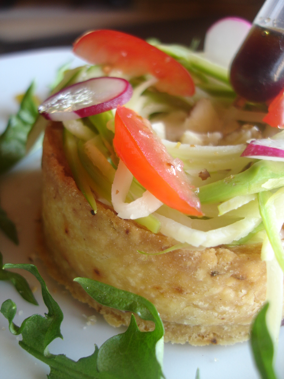 Je vous présente donc : Tarte à la crème de chèvre frais, nid d’asperges vertes et sa vinaigrette au balsamique de cerise.